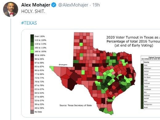 In Pennsylvania, the Democratic Lt. Gov. said on CNN this morning that 50,000 people attended a Trump rally this past week. He said the GOTV there by Trump has been strong, and the momentum is shifting towards the President.